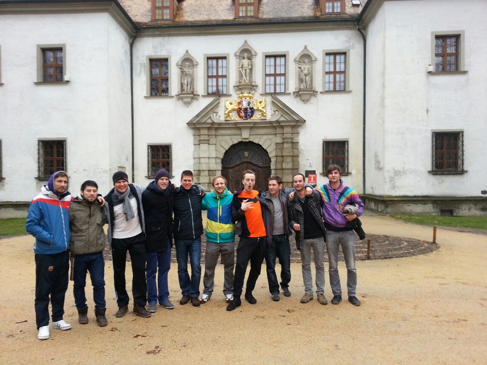 Schon die Hinfahrt war wieder typisch 1.KF. Am Ostbahnhof starteten wir mit 3 Autos Richtung polnische Grenze, doch schon an der Oberbaumbrücke hatten wir Karpartenbomber Jozsi das erste Mal verloren. Da sich dieses Trauerspiel jede zweite Ampel wiederholte, entschlossen wir uns, ihn erstmal zurückzulassen. Mit dem Navi würde er schon irgendwie ankommen. Papa Remo verstand das aber irgendwie falsch und meinte nun, die verbleibenden zwei Vehikel würden um den Sieg gen Sachsen fahren und trat, in seinem vollbesetzten Twingo, mächtig aufs Gas. Da der dritte Fahrer, Thaiterrier Jan, dieses Spiel nicht mitmachen wollte, waren ab dem Standrand alle auf sich allein gestellt. Knappe zwei Stunden später erreichte ausgerechnet Jozsi zuerst den letzten Checkpoint in Bad Muskau. Wie er das gemacht hatte, war allen schleierhaft. Wenig später traf das Trainerauto, um den Thaiterrier, den Cloppenburger Tortorero und den Übungsleiter in der Parkstadt ein. Doch wo war das Chaotenauto mit den Edelfans Remo und dem Sittenhengzt? Diese trafen 20 Minuten später ein, da Sie in Ihrem Geschwindigkeitsrausch doch glatt einige Ausfahrten verpasst hatten. Egal, vor Ort angekommen, frühstückten wir erst einmal geschlossen und schauten uns die örtlichen Sehenswürdigkeiten an. Dies ging zügig, da wir die Tour nach einer Fotosession vor dem Bad Muskauer Schloss beendeten. Wir waren schließlich (auch) wegen dem Hallenfussball hier!