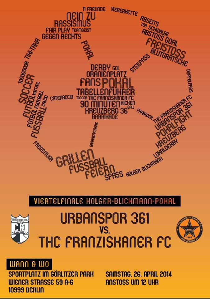 Ein ganz besonderes Wochenende steht auf dem Plan: Den THC erwartet das doppelte Viertelfinale im Holger-Blichmann-Pokal. Sowohl die Zweite als auch die Erste haben sich bis hierhin vorgekämpft und lassen die Chance auf ein THC-THC-Finale weiterleben. Aber zuvor müssen die nächsten Hürden genommen werden. Während die Zweite mit dem Landesligisten BSG DVS eine machbare Aufgabe vor sich hat, trifft die Erste auf den amtierenden Meister und Tabellenführer der Verbandsliga Urbanspor. Das alles ist natürlich schon Anlass genug, um diese Spiele zu zelebrieren – wenn es dann noch zur besten Zeit im Kreuzberger Kiez stattfinden, umso mehr! Nach dem Spiel der Ersten bei Urbanspor wird Peter uns mit Essen versorgen, Bier ist bestellt, Plakate sind geklebt – wir hoffen auf eure Unterstützung während der Spiele aber auch danach zur kleinen Kreuzberger Fußballfete.